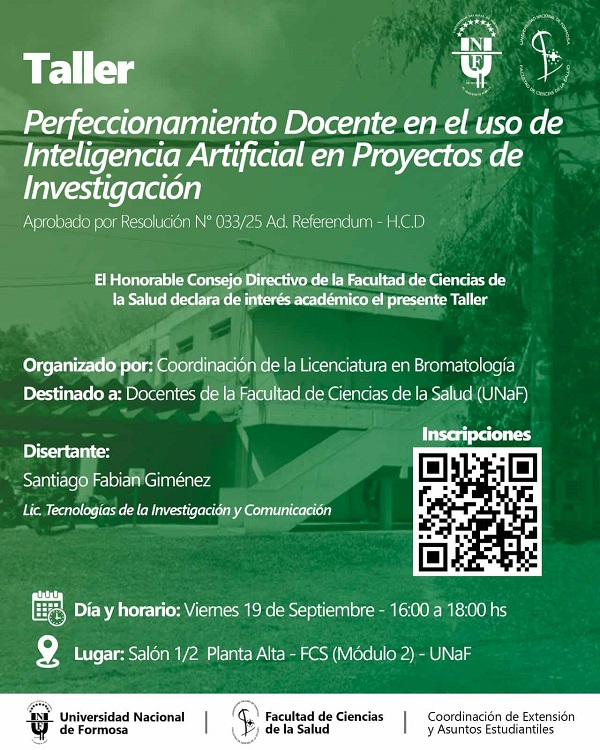 Este viernes 19 tendrá lugar en el Salón 1 y 2 de la Facultad de Ciencias de la Salud de la Universidad Nacional de Formosa (FCS-UNaF) un taller denominado “Perfeccionamiento Docente en el uso de Inteligencia Artificial en Proyectos de Investigación”.