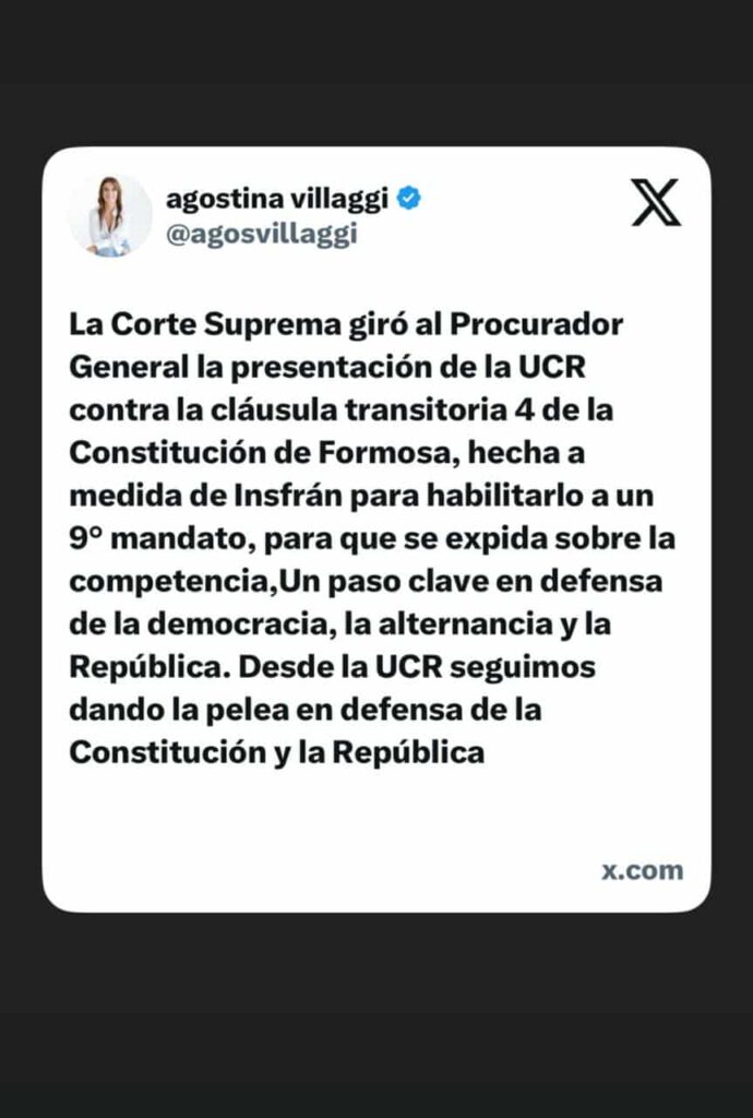 La diputada provincial por la Unión Cívica Radical (UCR), Agostina Villaggi, confirmó días atrás a este portal de noticias que ya se encuentra en manos de la Corte Suprema de Justicia de la Nación el pedido de inconstitucionalidad contra la cláusula transitoria cuarta de la Constitución de Formosa. Esta cláusula habilitaría al actual gobernador Gildo Insfrán y a su vicegobernador, Eber Solís, a postularse nuevamente en 2027, lo que representaría un noveno mandato consecutivo para Insfrán.