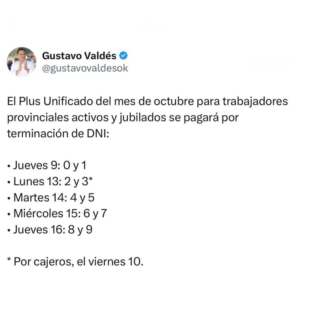 El gobernador Gustavo Valdés dio a conocer el cronograma de pago del Plus Unificado del mes de octubre para trabajadores provinciales activos y jubilados. Se pagará por terminación de DNI, a saber: Jueves 9: 0 y 1; Lunes 13: 2 y 3*; Martes 14: 4 y 5; Miércoles 15: 6 y 7; Jueves 16: 8 y 9. El tramo correspondiente a los DNI 2 y 3 estarán disponible por cajeros, el viernes 10.