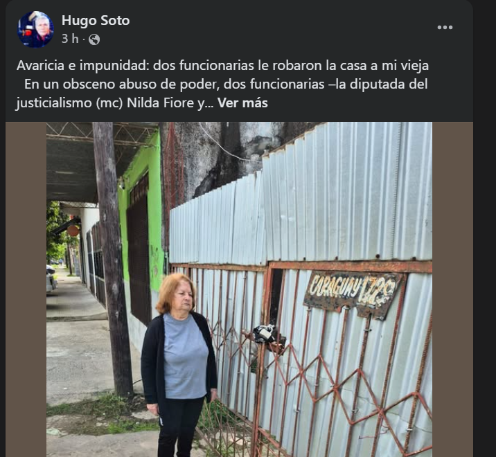 El periodista Hugo Soto de la ciudad de Formosa quien en las últimas horas denunció en su cuenta de facebook que la casa de su madre fue expropiada por dos funcionarias del gobierno de Gildo Insfrán. El periodista Fernando López de Radio Nacional confirmó que la prima del gobernador se habría quedado con la casa de la madre de su colega. La denuncia de Soto reza el siguiente texto: