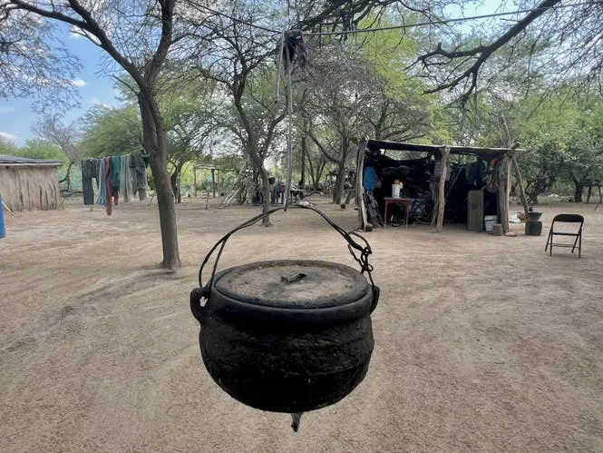 Dice que lo que más sufren es el calor, el viento y la lluvia. Dice que le gustaría poder hacerle paredes de ladrillos y tener chapas para el techo. “Acá es muy difícil hacer adobe porque no hay buena tierra y no tenemos agua”, afirma. —¿La casa tiene luz, agua, baño? —No tiene nada. El baño es un pozo en la tierra con palos y ahí nos sentamos. No tenemos aljibe ni tanque. Hay que ir a buscar al aljibe comunitario. —¿Cómo se las arreglan para dormir? —Tenemos un solo ambiente. No hay piezas. —¿Tienen camas o lo hacen en el piso? —Ella [en referencia a Santa] tiene cama y nosotros en el piso. Cuando el agua hierve, Ceferina le agrega fideos, arroz y porotos. Revuelve con una cuchara y tapa la olla. En general, su dieta consiste básicamente en esos ingredientes que compran cuando van a Potrillo porque en la comunidad no hay ningún comercio. Cuando pueden hacer huerta, consiguen algunas verduras. “Carne, nunca”, dice. Mientras espera a que se cocine, se sienta en una silla a la sombra a hacer unas pulseras con chaguar hasta que le duelen los dedos.