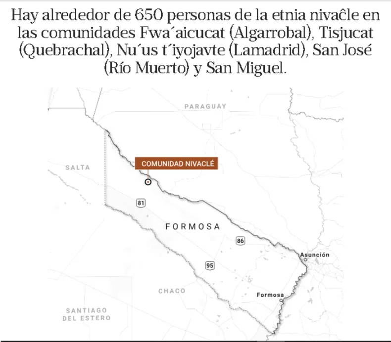 La provincia de Formosa reconoce formalmente a tres pueblos originarios que son el Qom, el Wichí y el Pilagá. El pueblo nivaĉle, que también habita la zona árida de sus entrañas y está desplegado mayoritariamente sobre la ruta 86, hace varios años viene luchando por, según ellos, esta reivindicación histórica. El último censo realizado en 2023 por la Asociación para la Promoción de la Cultura y el Desarrollo (APCD) señala que hay 650 personas de esta etnia en las comunidades Fwa´aicucat (Algarrobal), Tisjucat (Quebrachal), Nu´us t´iyojavte (Lamadrid), San José (Río Muerto) y San Miguel. También, existen familias dispersas en varios pueblos como Medialuna, El Potrillo y Las Lomitas. El gobierno provincial declinó de hacer comentarios al ser consultado para esta nota.