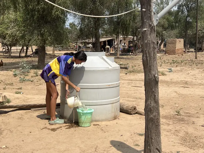 Son las 10 de la mañana de un miércoles de septiembre. Las cabras y los chanchos se ubican en la sombra para escaparse de un calor agobiante al que ya están acostumbrados. El viento es como un soplete que hace arder la piel. El sol lastima. Romina sale de su casa con un short y una remera de Boca. Camina hasta una pequeña construcción que funciona como lavadero y depósito, y agarra un balde. Va hasta la parte de atrás de su casa y lo carga con agua que saca de un tacho grande de plástico. Vuelve con el balde que va salpicando gotas en el piso y entra en un cuadrado de ladrillos sin techo que tiene una manta de puerta. Adentro solo hay una silla, un cacharrito de cocina, un pote de shampoo y otro de crema de enjuague. Lo último que hace es agarrar una toalla de un cable que hay al lado, en el que hay mucha otra ropa colgada, y se mete a bañar. Sale con la toalla enroscada en la cabeza, un pantalón violeta, una remera de fútbol y unas crocs. — ¿Qué te imaginás para tu futuro? — Estudiar, tener lo que siempre quise y darle lo mejor a mi mamá. — ¿Qué es lo que siempre quisiste? — Que no me falte comida ni agua.