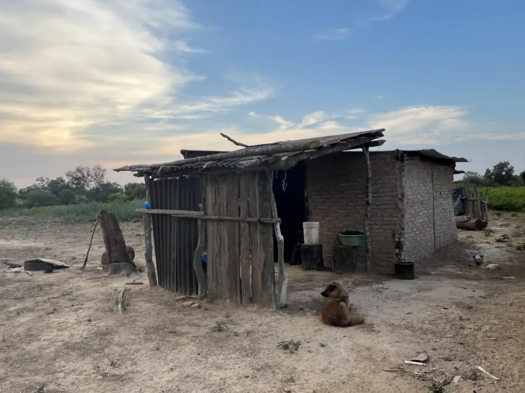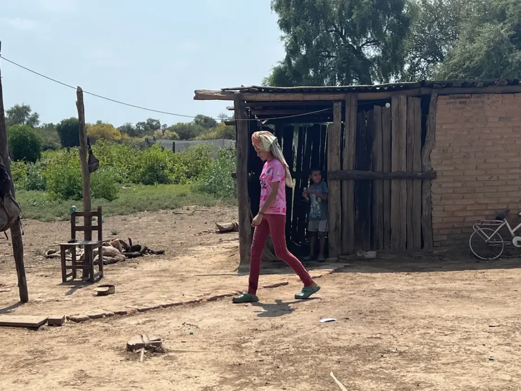La comunidad San José está ubicada en la periferia del pueblo Río Muerto, en el departamento Bermejo. Lo primero que llama la atención es la tierra seca en donde antes había un monte que tuvieron que hachar con sus propias manos para poder asentarse. Hoy, quedan solo algunos árboles. A 100 metros de la entrada, se erigen un salón comunitario y un aljibe. A la izquierda, se ve una casa. A la derecha, otras dos. Más atrás, otras tantas desparramadas en este territorio en el que viven alrededor de 100 personas y 18 familias. Hay otros seis aljibes que se llenan con agua de lluvia —que cuando se termina se repone desde un camión enviado por la provincia— cuenta con red de wifi, cancha de fútbol y de vóley, y se está construyendo una iglesia católica en honor a San José Obrero.