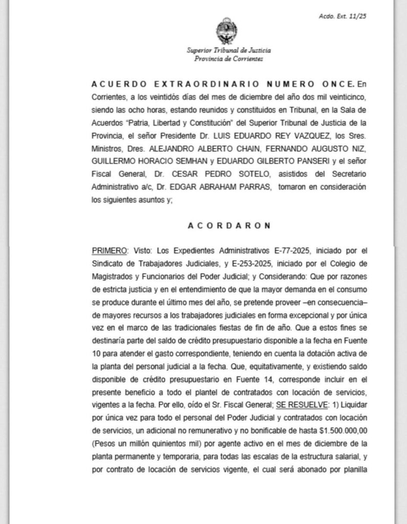 En el acuerdo extraordinaria N°11 de este año, el pasado viernes 19 de diciembre, el STJ de Corrientes dispuso: “Liquidar por única vez para todo el personal del Poder Judicial y contratados con locación de servicios, un adicional no remunerativo y no bonificable de hasta $1.500.000,00 (Pesos un millón quinientos mil) por agente activo en el mes de diciembre de la planta permanente y temporaria, para todas las escalas de la estructura salarial, y por contrato de locación de servicios vigente, el cual será abonado por planilla complementaria en tres (3) cuotas iguales y consecutivas durante los meses de diciembre de 2025, enero de 2026 y febrero de 2026. 2) Este adicional no será parte integrante de la base de cálculo de ningún concepto remunerativo y/o no remunerativo”.