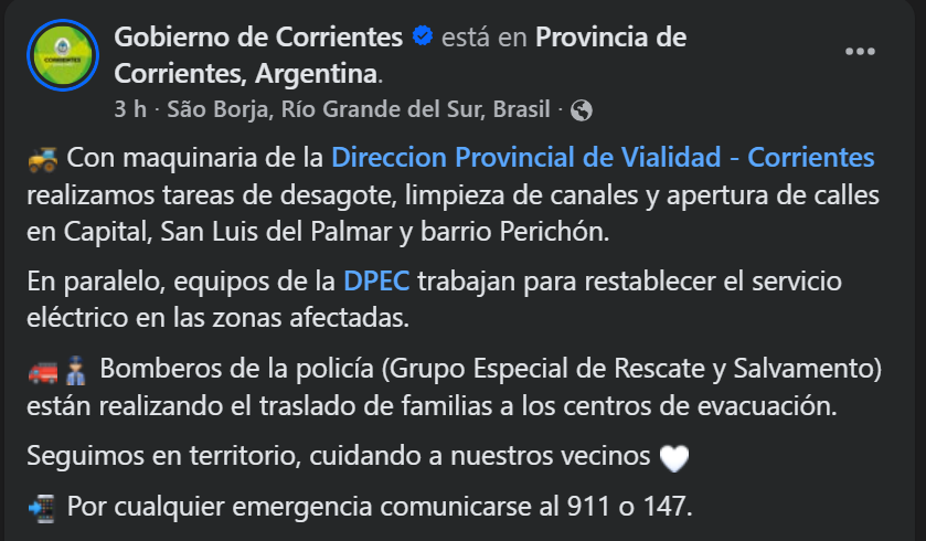 Las tareas de coordinación del COE involucran el trabajo de Defensa Civil de la Provincia, Bomberos Voluntarios y de la Policía de Corrientes, en plena colaboración con los equipos de la Municipalidad capitalina para la atención de damnificados, la cual incluye traslados a los centros de evacuación, abrigos y comida. Hasta horas de la siesta ya se registraban unos cien evacuados, pero esa cantidad irá incrementándose con el correr de los minutos, dada la situación relevada por los asistentes sociales que se encuentran desplegados en los sectores más críticos para detectar las familias que deben recibir asistencia.