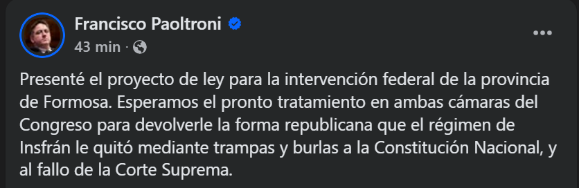 El senador por Formosa, y del bloque de la Libertad Avanza, el empresario agropecuario, Francisco Paoltroni presentó en las últimas horas, el proyecto de ley para intervenir la provincia de Formosa, gobernada por el caudillo formoseño Gildo Insfrán hace más de tres décadas. Así lo hizo saber en sus redes sociales Paoltroni.
